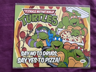 This is a cool print, autographed by Townsend Coleman, who voiced Michaelangelo in the original cartoon TV series. That’s also the version of the Turtles I best remember (and it caused quite a stir when it was shown on UK TV for the first time).
