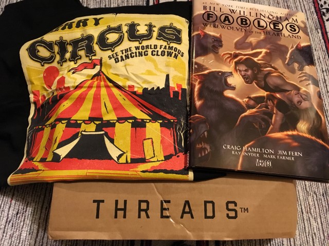 Threads is one of the Zavvi geek subscription boxes. It’s comes in a thin box which contains a book and an exclusive T-Shirt each month.